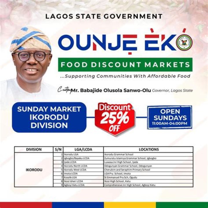 - Governor Babajide Olusola Sanwo-Olu has instructed the launch of 'Ounje Eko' food markets across Lagos starting March 17,