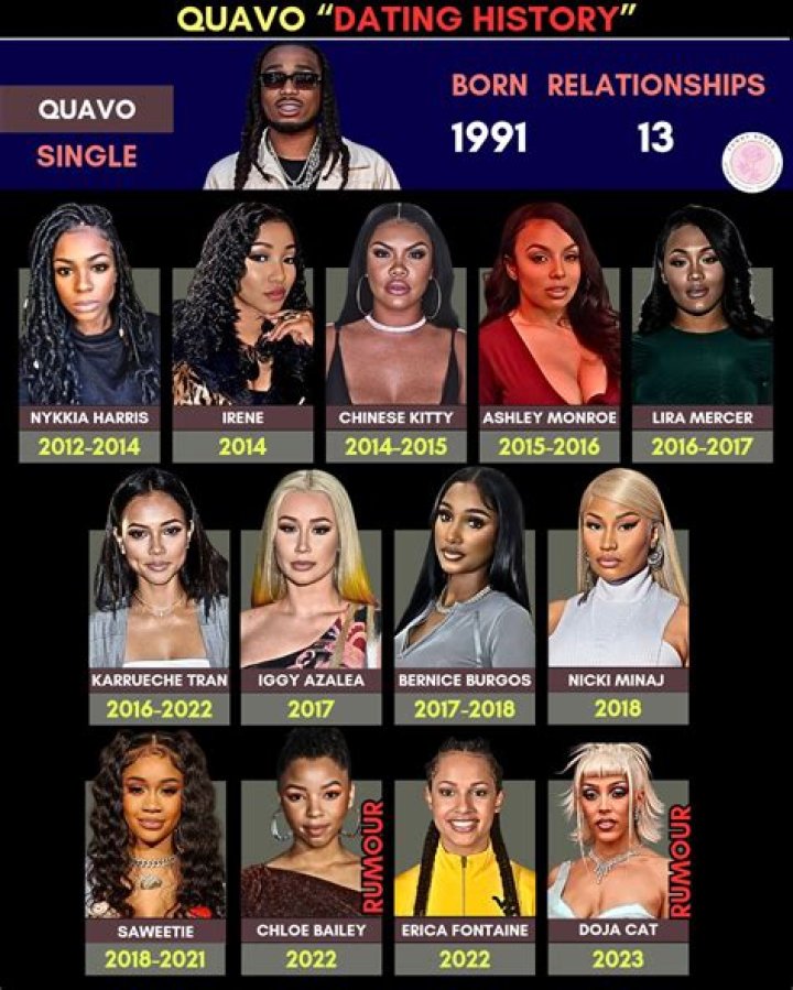 He has also been linked to rapper Iggy Azalea and actress Karrueche Tran. After rumors of Karrueche and Quavo being together arose, Karrueche tried to shut them all down on the Allegedly with Theo Von and Matthew Cole Weiss podcast. According to TooFab, she said of Quavo, "No, we're cool friends, we hung out, but it was nothing serious."