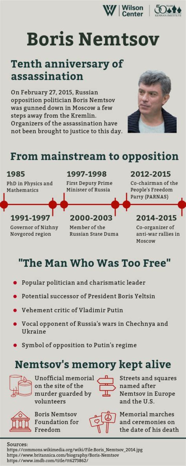 At the start of his political career, he was a member of the Union of Right Forces party. He later briefly belonged to the Solidarnost and People's Freedom parties before ultimately joining the Republican Party of Russia. A vocal critic of Russian President Vladimir Putin and an anti-Ukraine war Activist, he was assassinated in early 2015.