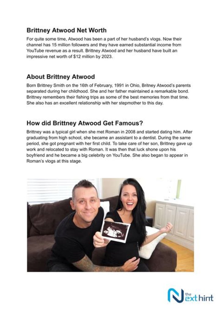 Brittney Atwood, the popular YouTube star hailing from Ohio, is expected to have a net worth ranging between $100K and $1M by the year 2024. With her entertaining videos, engaging personality, and dedicated following, it comes as no surprise that she has amassed significant wealth through her online ventures. Brittney Atwood is known for her creative content, as well as her collaborations with her husband, Roman Atwood, another well-known YouTube personality. With their combined talents and entrepreneurial spirit, the couple has built an impressive online empire, which is likely to continue thriving as their fan base continues to grow.