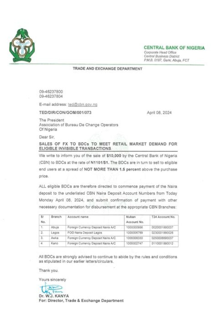 “All eligible BDCs are directed to make the Naira payment to the designated CBN Foreign Currency Deposit Naira Accounts and submit confirmation of payment, with other necessary documentations, for disbursement at the appropriate CBN Branches Abuja, Awka, Lagos, and Kano).”