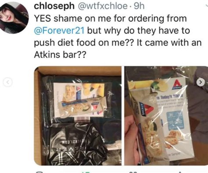 Women (it's always women) began tweeting out that their plus-size clothing orders from Forever 21 were arriving with a "complimentary" Atkins diet bar included. Two questions: Was Forever 21 not so subtly trying to tell them to lose weight? And How dare they?