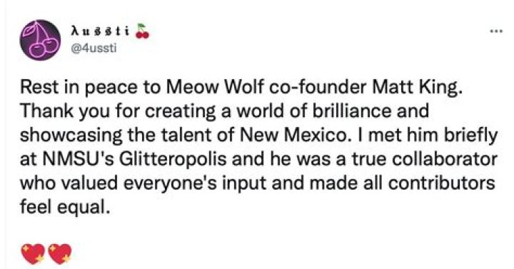 "The Meow Wolf community is devastated and in absolute shock by the sudden passing of Meow Wolf co-founder, artist, and dearest friend Matt King. Our thoughts and condolences go out to his family, friends, and everyone who knows and loves him," the announcement reads.