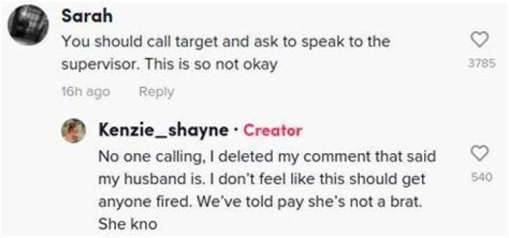 Kenzie said that she is not calling Target but her husband would be. Other users suggested that there was more to the story, but Kenzie denies this is the case: "What else would be part of the story hahahhaha like why would I lie about what someone said to my kid? She literally LOOKED at This lady and she said she had a bratty face. I didn’t get this lady fired. I didn’t complain. I killed her with kindness and walked out. Thanks!"