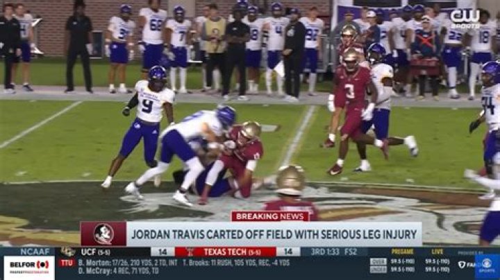 Travis came down awkwardly near midfield after picking up a first down on a run, appearing to injure his left ankle as he was dragged to the ground by a North Alabama defender. Florida State’s left leg was put into an air cast, and he was carted off the field and taken to a nearby hospital.